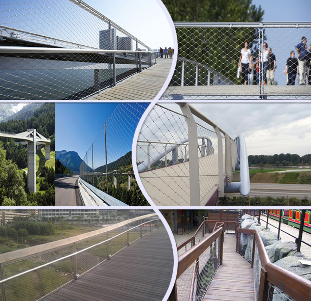 不銹鋼繩網(wǎng)(橋梁用網(wǎng))(橋梁鋼絲繩網(wǎng))(橋梁防護網(wǎng))(橋梁護欄)是由不銹鋼繩上下絞織與鋼套擠壓而成,鋼絲繩直徑有1.2、1.5、2.0、3.0、3.2mm,鋼絲繩結(jié)構(gòu)有7*7、7*19、1*19等,材質(zhì)有304、316、316L,其次我們還可以提供熱鍍鋅鋼絲繩網(wǎng)產(chǎn)品。鋼套材質(zhì)主要采用不銹鋼套,其它還有鋁套、銅套、銅鍍錫套以供客戶選擇。產(chǎn)品應用于橋梁防護、安全、吊橋防護等。